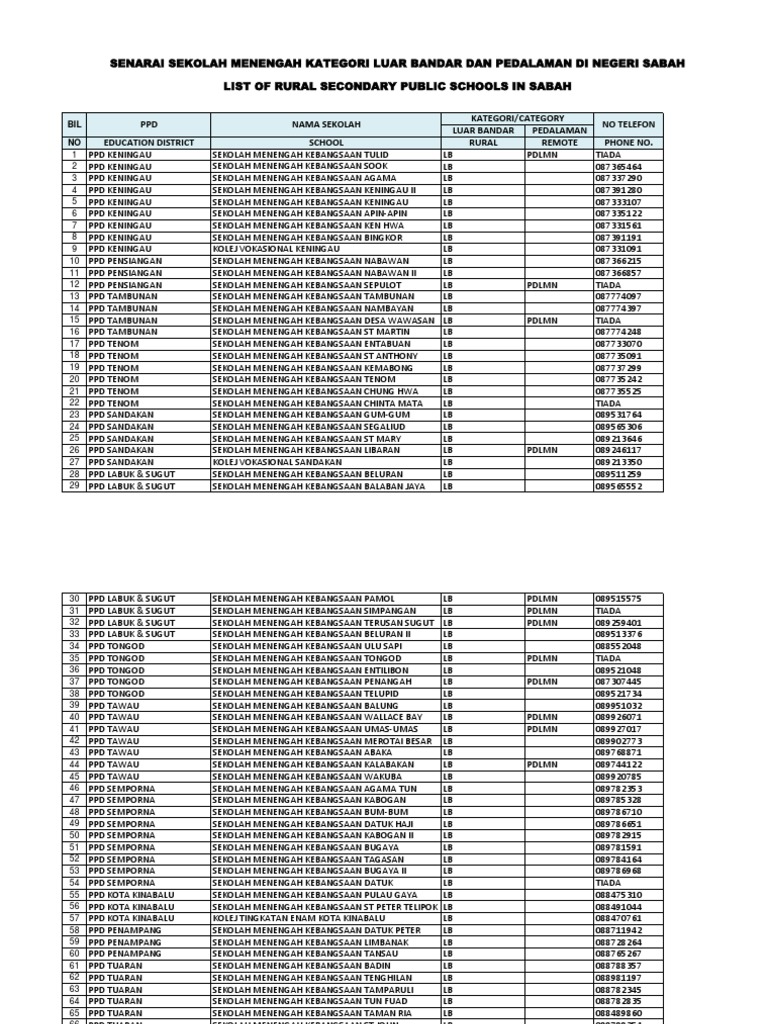 Senarai Sekolah Menengah Kategori Luar Bandar Dan Pedalaman Di Negeri Sabah Pdf