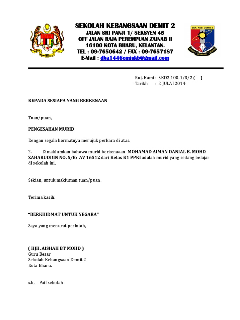 Keperluan am semasa menulis surat dalam kes perubatan pengesyoran pengesahan surat rasmi perniagaan dan tidak rasmi adalah begitu banyak yang perlu anda fahami. May 31 2015 contoh surat rayuan egtukar sekolah. Rincian contoh surat pengesahan pelajar sekolah menengahdoc Ada 12 halaman contoh surat pengesahan pelajar sekolah menengah ukuran.